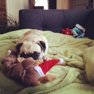 ナナさんにも、おもちゃやお菓子、冬用ブーツ、Poop Bagなどサンタさんからたくさんプレゼントが届いていましたよ。ナナさんも、今年とってもいい子にしていたからね!