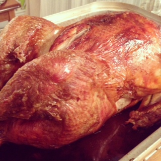 今年はブライン液に漬けておいた7キロのターキーに、りんごと玉ねぎを詰めて焼きました。