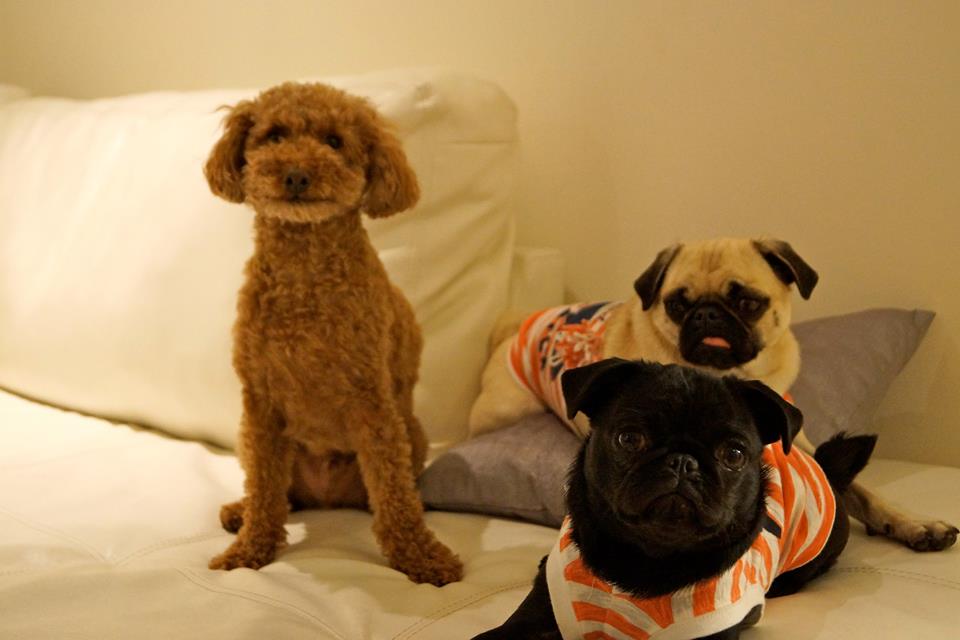 おパグさんたちは(もちろんSchatzieも)、お食事中じっと大人しくしてくれるので助かります。しかしパグズに椅子を占領され、飼い主の座る場所はかなり狭いです。しかもカメラを構えると、椅子一杯に広がるという (;´Д`)アウ...