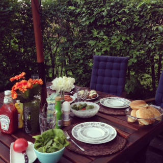メニューはホットドッグと、ブルーチーズ入りの特製ハンバーガーです。サブ飼い主さんが手作りパティを、テラスでBBQしてくれました。ブルーチーズのとろーりとろけたパティにお好みの具を挟み、テーブルで自分のオリジナル・ハンバーガーを作ります。ハンバーガーとホットドッグのお供には、サラダとベイクド・スウィートポテトなお夕飯。やっぱり、ごはんを誰かに作ってもらうのはいいですね!サブ飼い主さん、ありがとう。