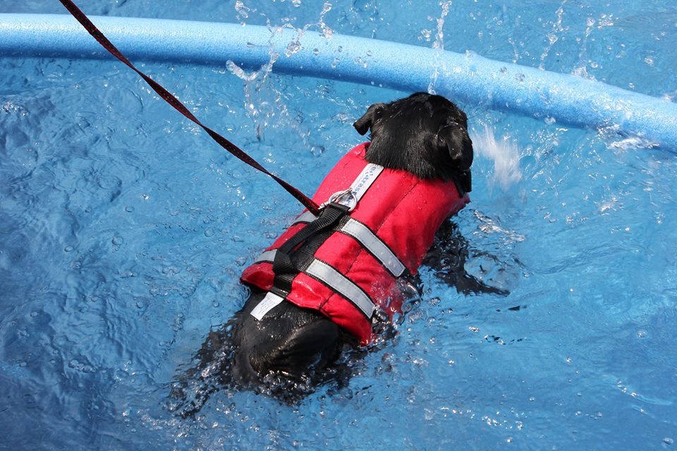 プールサイドへは興味津々に近づいていたため、どぼーーーーんと一気に入ってもらいました。