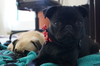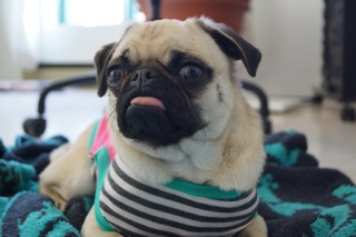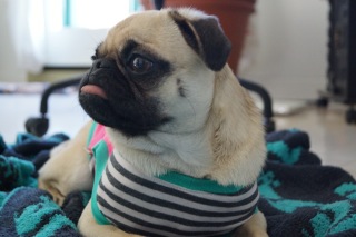 ですよね・・・なぜに???って思いますよね。でも、小さい頃の写真を見るとナナさん、ブリーダーさんのお宅でパグズの群れに入れてない写真ばっかりなんですよ。1人デジャヴだったのかも(汗)