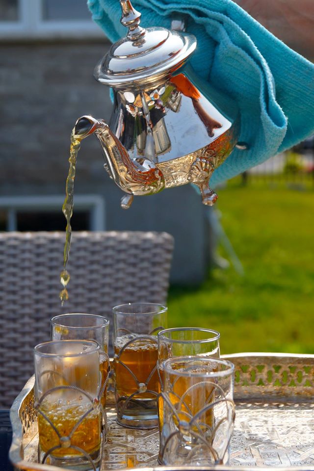 モロッコ旅行で購入して帰った茶器に、これまたモロッコから持って帰ったお茶を使い、フレッシュハーブとお砂糖をたっぷり入れて作ります。高い位置からお茶を注ぐことで、よい香りがたつそうな。