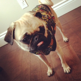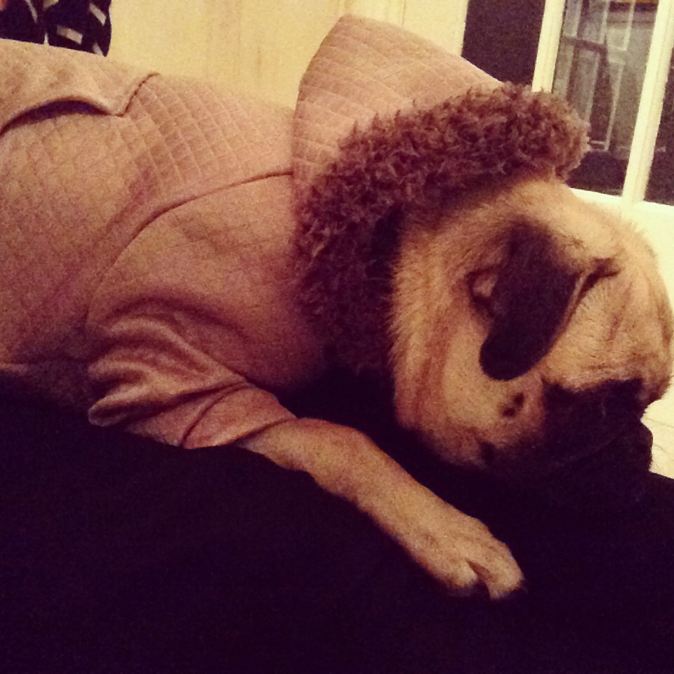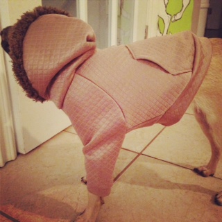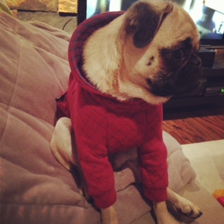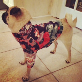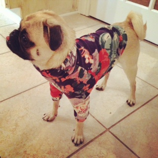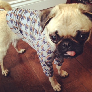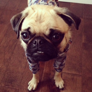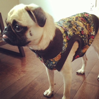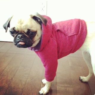 やっぱり女子はピンクが似合いますね!パグ座りもなんのその。ジャージー素材なのでぴったりサイズなのにくつろげる、そんな賢いお洋服であります。