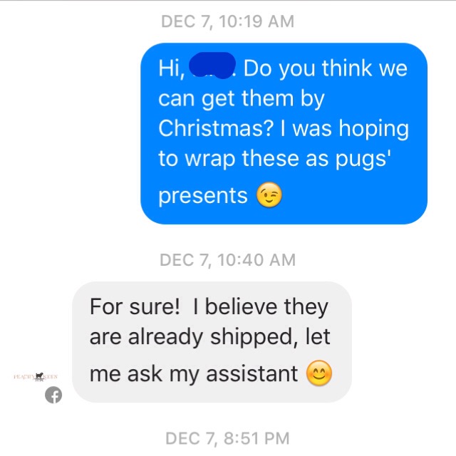 クリスマスまでに送ってもらえるかどうか、飼い主より確認。