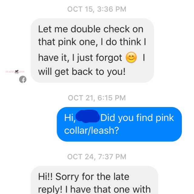 3週間経過しても、ピンクカラー&リーシュが届いていない旨連絡。
