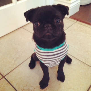 若干大きめですが、許容範囲内。そもそも夜道で相手に注意を促す意味では、黒パグにぴったりなお洋服ですね。