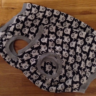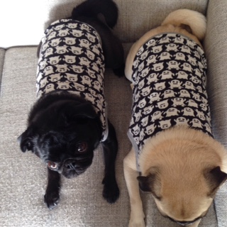 MOMODO.さんのお洋服は既製品サイズにもかかわらず、ナナ&ジャズにぴったりフィットするところが気に入っています。生地の肌触りがとても柔らかく、おパグさんたちもお洋服を嫌がりません。