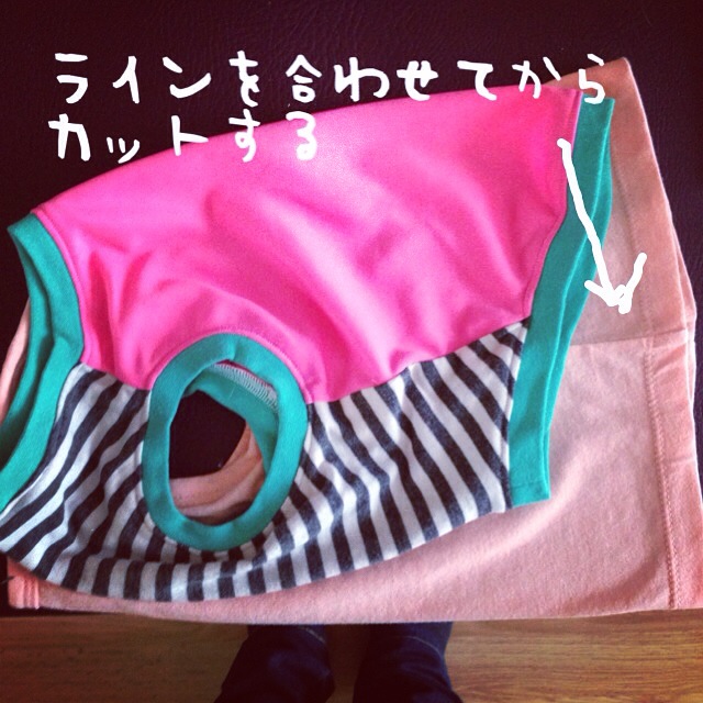 子供服にパグ服を重ねてからカットします。その際、子供服のサイドのラインをあわせるようにしてください。(子供服の左右のラインが、上下で重ねた時に合うように)