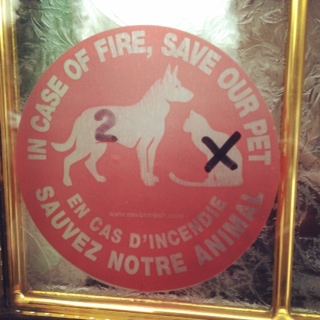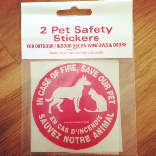 ステッカーには英語と仏語で「火災の場合にはペットを助けてください」と書かれています。消防士さんたちはドアや窓を壊して家の中に入る事ができますので、火災時にパグズを助けてもらうことが目的です。