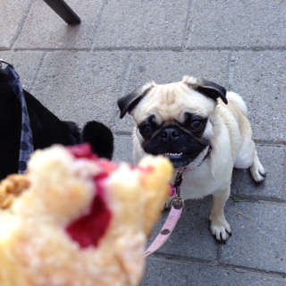 もちろん店内にわんこは入店出来ませんので、ナナ&ジャズはお外にて待機です。店内のサブ飼い主さんをじっと見つめるおパグさん。