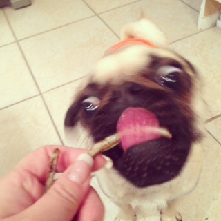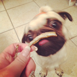 スメルト以外のおやつで再度試してみたところ、やはりこのお写真どおりずーーーーっと待っていられました。スメルトには、ナナさんの集中力を欠く大変ななにかがありそうです。