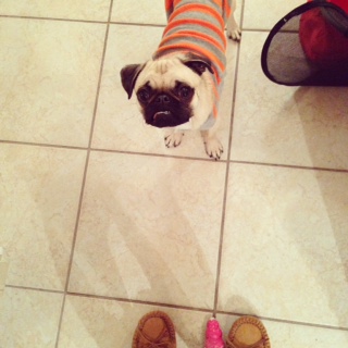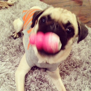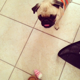 小腹が空いた時のナナさんは、飼い主のもとへKongを持ってきます。わざと無視しても気付かせようとし、何回もばんばん音を立てて投げ落とします。