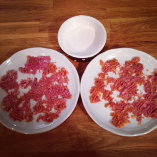ボウルだと10秒で完食してしまうナナさんも、プレートに平にすることでかなりの時間稼ぎになります。こうすると食事を食べ終わるには1皿1分くらいかかるので、2皿だと2分にも!さらに、(2皿を食べさせることで)実際の量は変わらなくとも、ナナさんがたくさん食べた気になります。