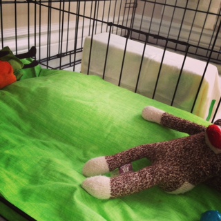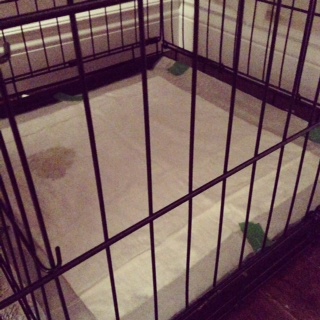 トイレシートは動かないよう、マスキングテープで止める荒技です。(日本からメッシュ付のトイレトレーを購入したのですが、クレートには大き過ぎて使えていません 。・゚・(ノД`)・゚・。)