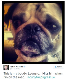 ロビン・ウィリアムズさんがパグ好きってこと、あんまり日本では知られてないのかな?ファンから「人生において重要なことはなにか」と質問されたとき、彼は「家族、友人、そしてペット。忠誠心はパグに勝るものはない」って応えたり、トークショーに出ても、飼ってるパグちゃんの話をよくされてました。