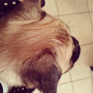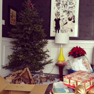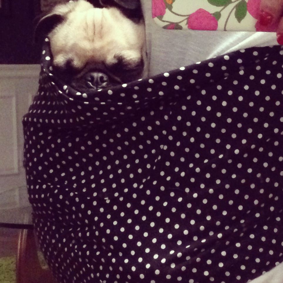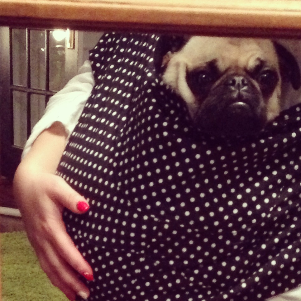 飼い主がソファに座ってオーナメントを整理しようとすると、どうしても膝で寝ようとがんばります。そこで、ナナさんをドッグ・スリングに入れて続行することにしました。