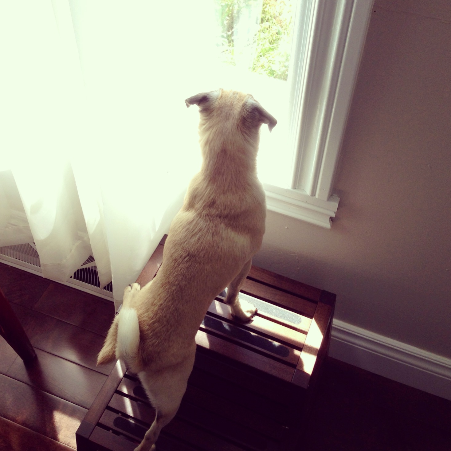 飼い主をけなげに待ち、ドライブウェイを眺めているようです。