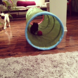アジリティを始めたときに、ナナさんが怖がってトンネルに入れなくて。自宅用に購入してみました。使わないときは小さく収納できるのでオススメです。トンネルに入れたらおやつをあげる~ってのをやると、うるまくんも使ってくれるかもしれません~。ぜひ、ぜひ!