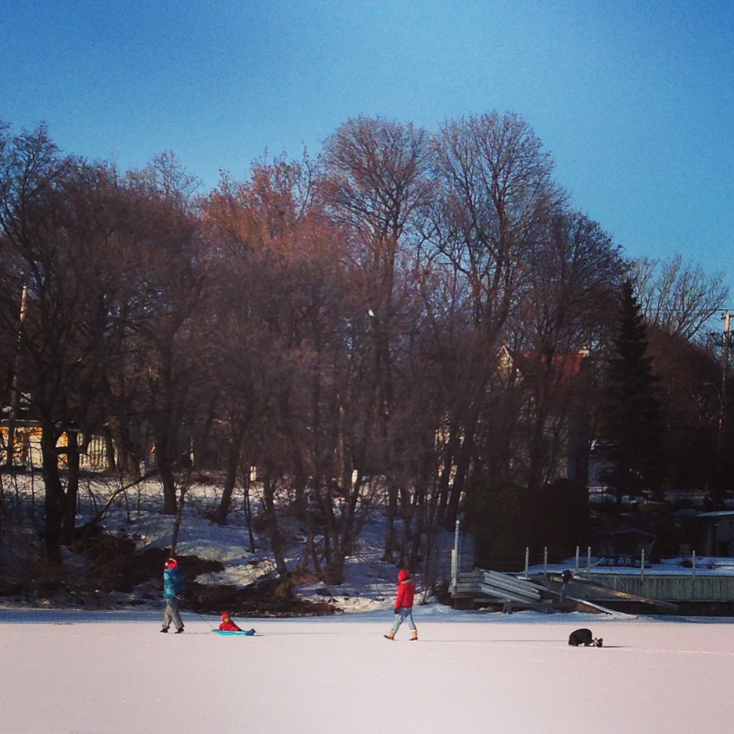 こちらのご家族は、凍った川の上でそり遊び。