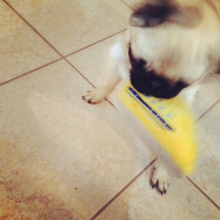 黄色でよく見えやすいからか?ナナさんも、気に入ってくれたみたいです。ぶんぶん振り回して遊んでます。ステキなおもちゃをありがとね〜!!!!