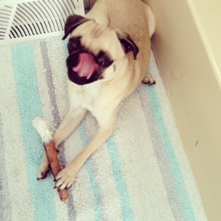 Chew Treatを食べながら、シャワー中の飼い主を大人しく待っています。