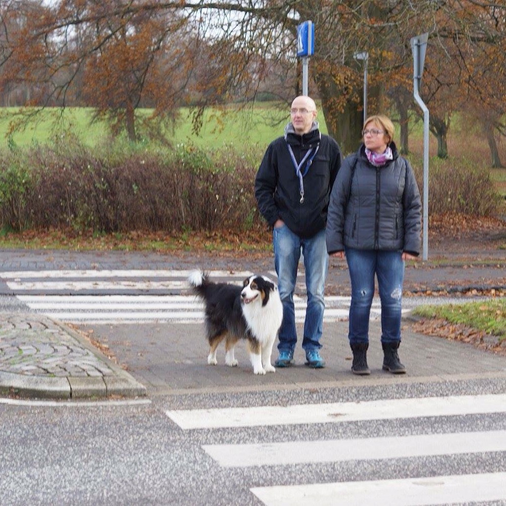 飼い主さんと歩調をあわせて横断歩道を渡り、そのまま側にぴったりとくっついていました。