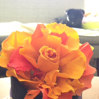 実際にお花をむしゃむしゃしているところを目撃したわけではないのですが、犯人は背後の黒いわんで間違いないでしょう・・・。オットマンを踏み台にし、(プリザの置かれた)コーヒーテーブルの上でドヤ顔ポージングのジャズミンを何度か発見したことがありますから。