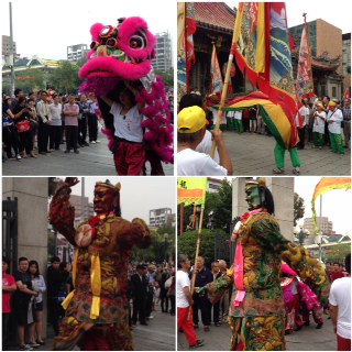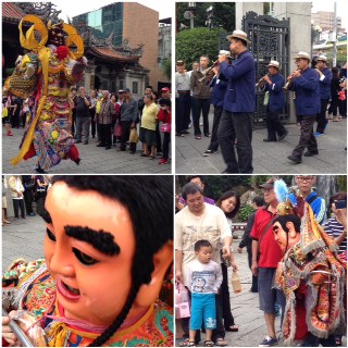 キャラクターたちは、台湾の神様だそうで。パンで出来たネックレスを首からかけていた神様たちですが、お付きの方がそのパンをちぎってどんどん参拝客向かって投げまくります。お祭りに偶然遭遇したことがすでにグッドラックらしいですが、飛んできたパンを食べるとさらに良いそうです。