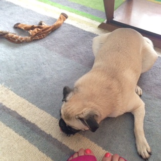 飼い主の足元でおやつを噛み噛みし、お昼寝します。