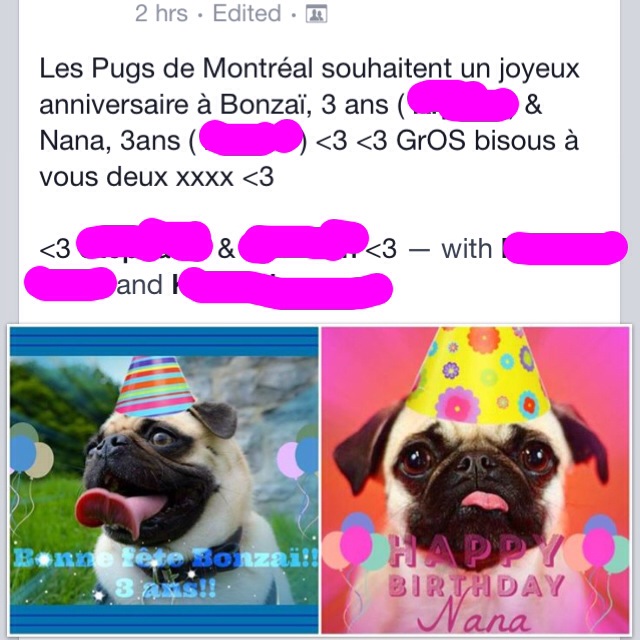 さらにモントリオール・パグクラブFBでも、ナナさんとBonzaiくんのお誕生日をお祝いしてくれました。