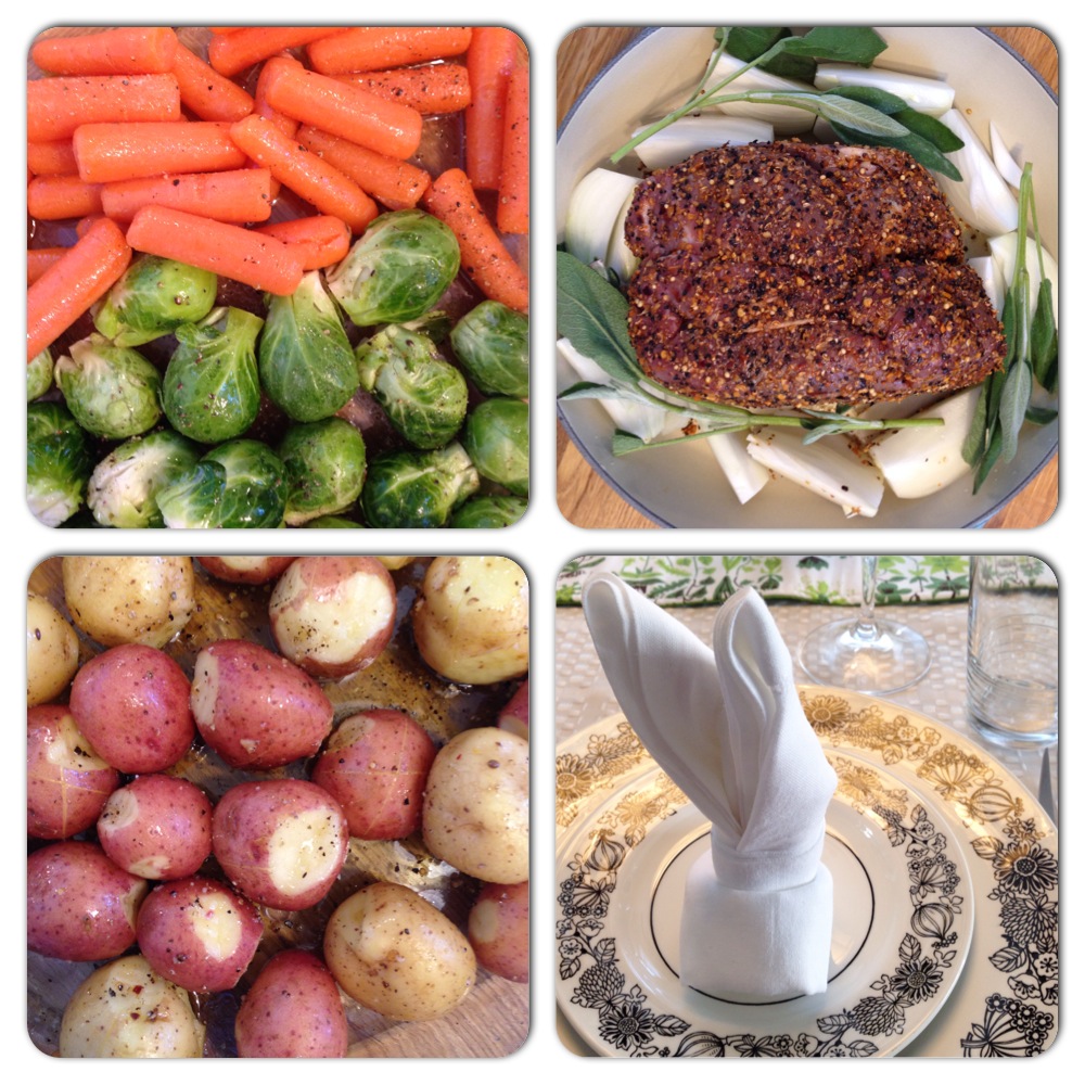 他には前菜にチーズプラッターやナッツ類、ポテト・芽キャベツ・にんじんのロースト、ほうれん草&グレープフルーツのサラダ、チェリートマト・きゅうり・ボッコンチーニチーズのサラダ、イースターバンズを添えました。