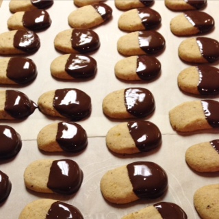 Hazelnut Chocolate Cookiesは、ヘーゼルナッツの粉末をミックスしたクッキー生地を焼いてから、仕上げに湯せんしたチョコレートにディップしましょー。