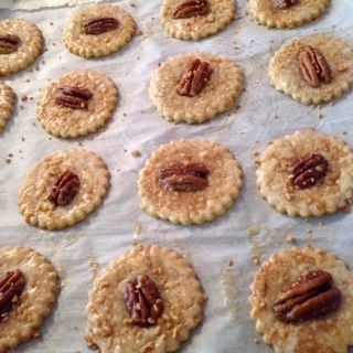 Maple Pecan Cookiesは、ピーカンナッツの粉末とメープルシロップをミックスしたクッキー生地です。オーブンに入れる前にピーカンナッツを飾ってから卵黄を塗り、メープルシュガーをトッピング。 メープルシュガーをトッピングすることで、カリカリの口当たりに変身します。